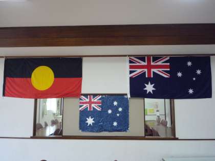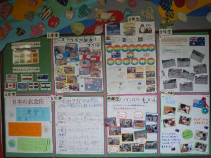 また、ランチルーム内には親善訪問団からいただいた「オーストラリア」と「アボリジニ」の旗を飾っています。間に飾られているのは1年生の児童が作成したオーストラリア国旗です。作成の様子と併せてご覧ください。