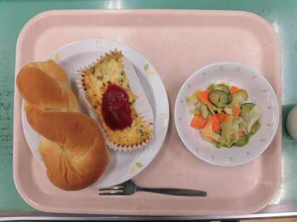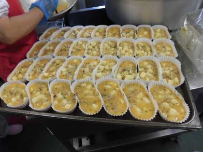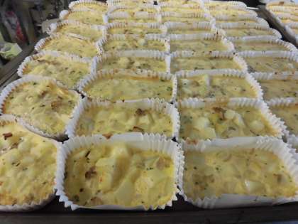 スペイン風オムレツの特徴は具の中にじゃがいもが入っていることと、しっかり加熱調理することです。カップに1つずつ均等にオムレツ液を入れて、オーブンで焼き上げました。