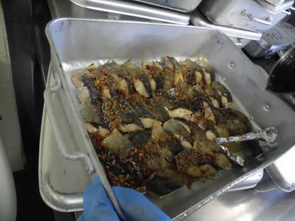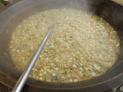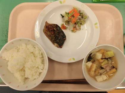 さつまいもやぶた肉など具だくさんなさつま汁は鹿児島県の郷土料理です。また、さつま汁のこまつなには世田谷産を使いました。本日の魚はあじ、ねぎ・ごま・しょうがを使った七味だれで青魚独特の臭みがあるあじを食べやすくしました。