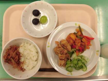 本日6年生4校時の授業は通常通り給食を盛りつけたあと、持参した弁当箱に自分で盛りつけをするお弁当詰め給食です。大好きなとり肉のから揚げ・くだものにはきょほうとマスカットなど、栄養バランス・味・いろどりなどお弁当向きの給食にしました。