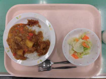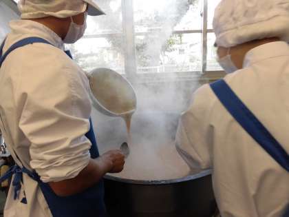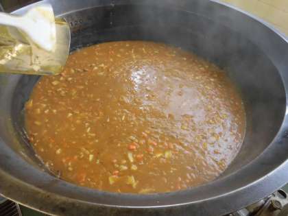 本日は子どもたちが大好きなチキンカレーライスです。チキンカレーの具をじっくり煮こみ、給食室で作ったカレールーを別の調理員さんにゆっくり入れてもらい、再びこがさないように混ぜながら煮こんでいます。ルーを混ぜてからじっくり煮ることで、おいしいコクがうまれます。