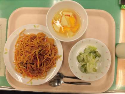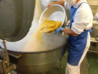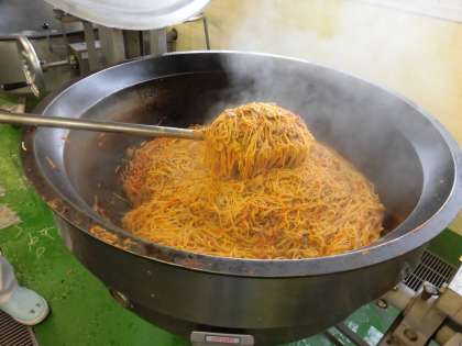 スパゲティは回転釜にたっぷり沸かしたお湯で固めにゆでます。隣の回転釜で具を炒め、ゆでたスパゲテイと素早く混ぜてナポリタンのできあがりです。粉チーズも入っているので、口当たりがよく食べやすくなっています。