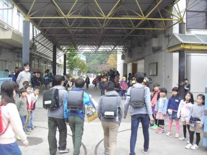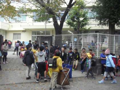 この日は11月のあいさつ週間3日目でした。正門では1年生が元気にあいさつ運動に取り組みました。東門では5年生があいさつ運動をしました。また、エコ委員会の資源回収活動も行われていました。