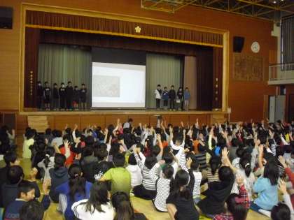 今朝は体育館で「委員会活動紹介集会」を開きました。飼育・栽培委員会、運動委員会、エコ委員会が活動内容を紹介しました。全校の子どもたちは、高学年の委員会活動によって学校生活が支えられていることを実感していました。
