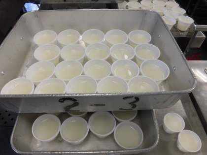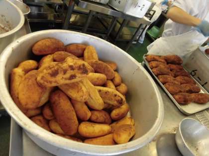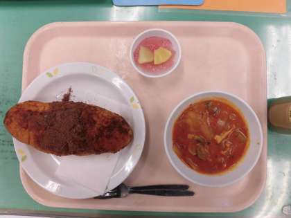 本日は子どもたちが楽しみにしていたリクエスト給食です。とり肉のトマト煮以外は子どもの票で決まった献立です。カルピスゼリーの上にはクラッシュゼリーとくだものをのせて色あざやかなゼリーになりました。ココア揚げパンは油っぽくならないように短時間だけ揚げているので、後味が軽めの食べやすいパンです。