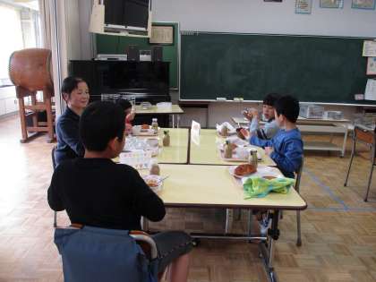 4年生とつくし学級の「給食交流」今日は3回目でした。4年1組の5人の子どもたちが学習室を訪問し、つくし学級の子どもたちと一緒に、給食を食べました。今日は、子どもたちが楽しみにしていた「リクエスト給食」の献立でした。「ココア揚げパン・とり肉のトマト煮・コーヒー牛乳・カルピスゼリー」みんなのリクエストで決まった美味しい給食に会話もはずみ、仲よく味わいました。