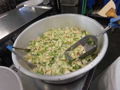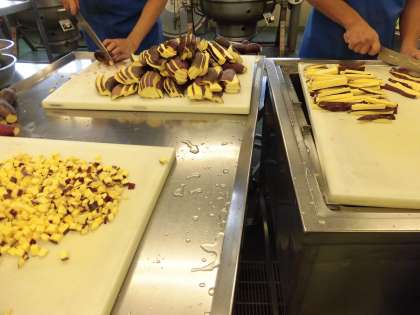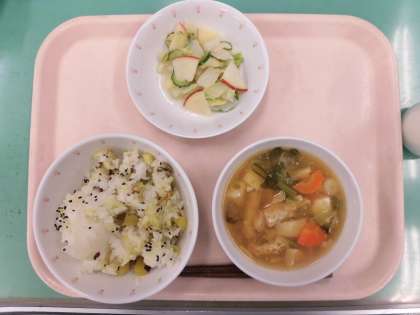 さつまいもは生のまま米などと炊飯釜に入れて炊きました。調理員さんたちで手分けをしてさつまいもを切っています。白菜とりんごのサラダは生りんごの酸味と甘味で、後味さっぱりとした味になっています。