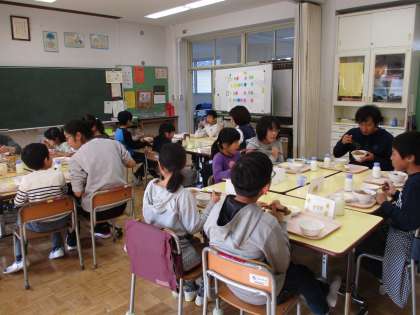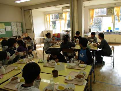 4年生とつくし学級の「給食交流」今日は5回目でした。4年1組の6人の子どもたちが学習室を訪問し、つくし学級の子どもたちと一緒に、給食を食べました。配膳を終え、12時25分に「いただきます。」をしました。まず10分間は、静かに食べ、それから、自己紹介をした後、しりとりを楽しみました。美味しい豚丼を味わいながら、会話もはずみ、楽しい給食の時間となりました。