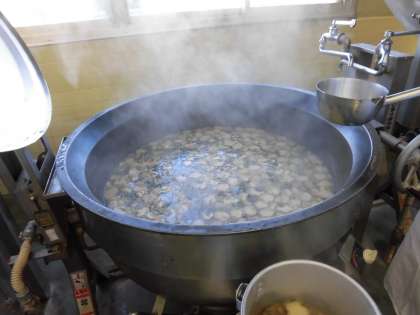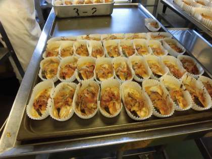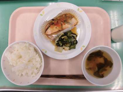 鮭の上にみそで味をつけた具をのせてオーブンで焼き、鮭のちゃんちゃん焼きができあがりました。鮭のちゃんちゃん焼きは北海道の郷土料理です。給食では国内の郷土料理や世界の料理を子ども達に伝えています。すまし汁にはしっかりだしのうま味がしみこんだ花ふが入っています。