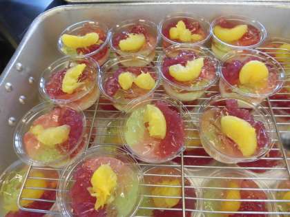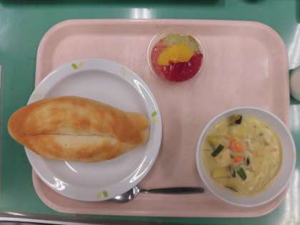 今日と明日の給食は、展覧会のテーマに合わせた献立になっています。本日はかぼちゃやさやいんげんなどが入ったさつまいもシチュー、4色ゼリーにあなまつをのせたカラフルゼリーと、季節感があるカラフルな給食になりました。