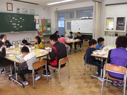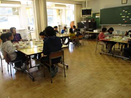 4年生とつくし学級の「給食交流」今日は6回目でした。4年2組の6人の子どもたちが学習室を訪問し、つくし学級の子どもたちと一緒に、給食を食べました。10分間静かに食べてから、自己紹介をしました。その後、しりとりをしたり、じゃんけんをしたりして交流を深めました。和食の献立「魚の塩焼き・こんにゃくサラダ・ごはん・味噌汁」を美味しくいただきながら、会話もはずみ、楽しい給食の時間を過ごしました。