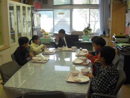 今日は5年生を対象とした校長室会食会(3日目)でした。楽しく会食しつつ、子どもたちが話す内容をメモしながら耳を傾けてくださる校長先生。子どもたちはインタビューを受けて得意げに話をしていました。