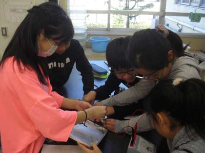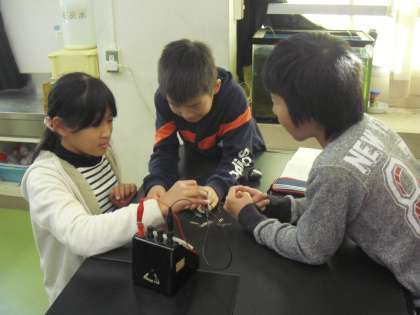 その後、5校時に1組が理科「電流のはたらき」の学習をしました。電磁石の性質について、予想したことを確かめる実験をしました。「コイルを巻く向きとN・S極には関係があるのではないか。」、「電流のプラスとマイナスは、電磁石のN・S極と関係があるのではないか。」など、子どもたちが立てた学習課題を突きとめるため、主体的に実験に取り組んでいました。