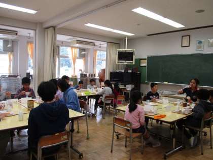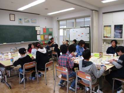 4年生とつくし学級の「給食交流」今日は7回目でした。4年2組の6人の子どもたちが学習室を訪問し、つくし学級の子どもたちと一緒に、給食を食べました。みんなで「いただきます。」をして、10分間は、静かに食べました。それから、自己紹介をした後、今日もしりとりを楽しみました。美味しい「ジャムサンド・トマトシチュー」を味わいながら、会話もはずみ、楽しい給食の時間となりました。