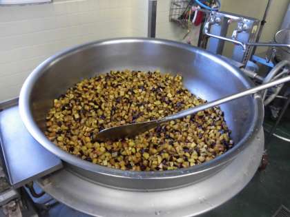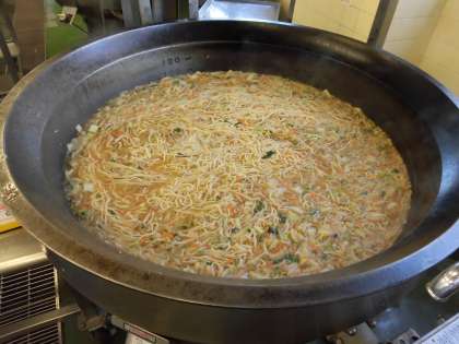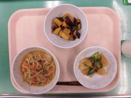 こがした砂糖に水とバターを加えてキャラメルソースをつくり、素揚げしたさつまいもとあえてキャラメルポテトのできあがりです。ぶたひき肉と野菜のうまみがおいしい、みそラーメンもできました。