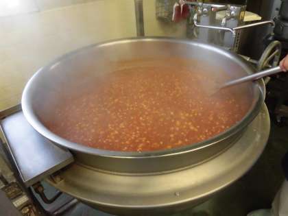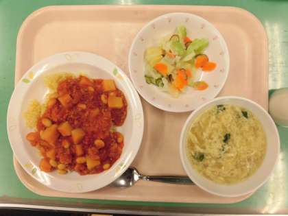 カレー風味のごはんを炊き、チリコンカンをかけてチリビーンズライスのできあがりです。じっくり煮込んでいますので、うまみがよく出て少し辛いソースもおいしく食べられます。優しい味のかきたまスープもできあがりました、