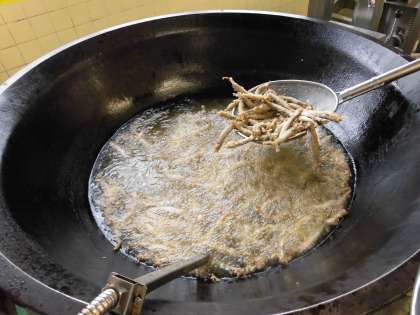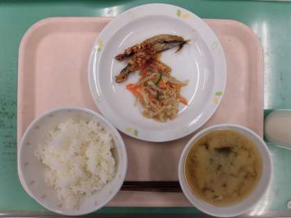 から揚げにしたししゃもをみじん切りにしたねぎ入りのソースにかけて、ししゃものねぎソースのできあがりです。ソースの酸味と揚げたししゃもの食感がとても合い、人気がある献立です。体が温まるみそ汁もできあがりました。