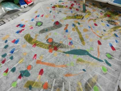 本日は、黒いインクで刷った版画作品の裏側から、絵の具で着色をほどこす<裏彩色>に挑戦しました。かの、棟方志功や伊藤若沖も作品づくりに用いた技法です。