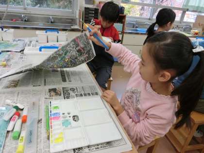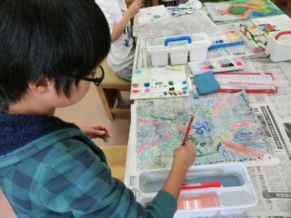 子どもたちは、作品の見え方の違いに感動したり、興奮したりしながら、色塗りを楽しんでいました。どんな作品に仕上がるのか、いまからとても楽しみです!!