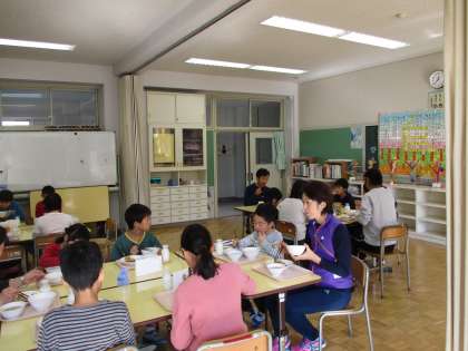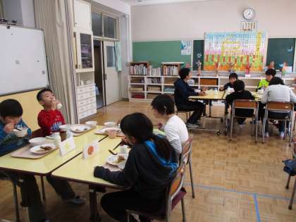 4年生とつくし学級の「給食交流」今日は9回目でした。4年1組の5人の子どもたちが学習室を訪問し、つくし学級の子どもたちと一緒に、給食を食べました。3つのテーブルに分かれて座り、お互いに自己紹介をした後、今日もしりとりを楽しみました。