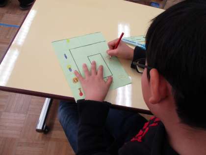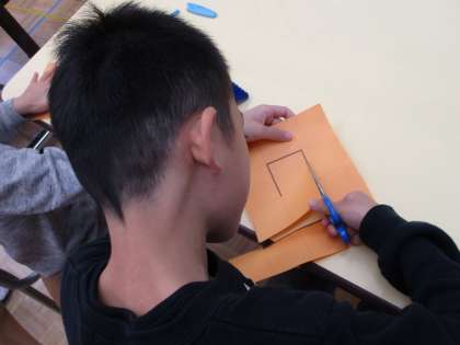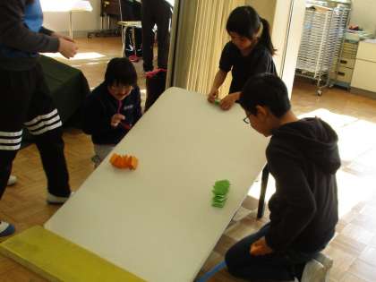 4時間目に図工の学習をしました。今日は、「つくってあそぼう!じゃばらくん」という工作をしました。「じゃばらくん」の型紙に自分の名前と好きな絵や模様を描いて、切り取り線をよく見てハサミで切りました。切り取ったら、次は、折り線にそって、表・裏と交互に折って、四角い形を作れば出来上がりです。どの子も手元をよく見て作っていました。布製のボードを斜めに立てかけ、その上に「ポン!」と置いてみると、「じゃばらくん」がひとりで動き出し、斜面をおりていきます。「すごいね。」「おもしろいね。」「つぎは、ぼくがやってみるよ。」等々、みんなで話をしながら、楽しむことができました。