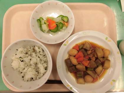 炊きたてのごはんにわかめとじゃこを混ぜ、磯の香りと炒ったじゃこの食感がおいしいごはんができあがりました。とり肉とさといものうま煮のさといもは、軽くゆでてから煮ていますので煮崩れしにくく味がよくしみこんでいます。