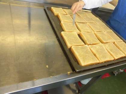 食パンにごまペーストを1枚ずつ丁寧にぬっています。オーブンで焼き、香ばしいセサミトーストのできあがりです。 人気があるミネストローネには、味だけではなく見て楽しめる、かわいいアルファベットマカロニが入っています。