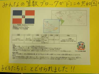 去年、烏山小学校では、1,2年の算数で使った算数のブロックをJICAに送りました。先週、その算数ブロックはドミニカ共和国に送られたという証明書が届きました。