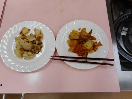 「ジャーマンポテト」「ちくわとじゃがいもの油いため」のどちらかを班で相談して選び、調理しました。ピーラーを使わずに包丁で丁寧に皮をむきました。