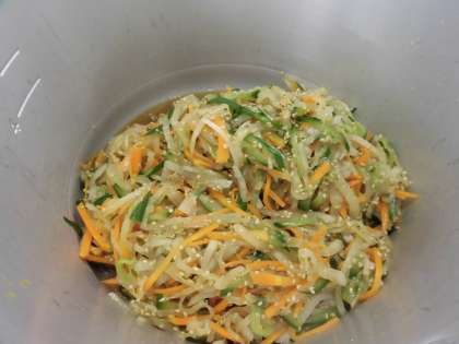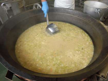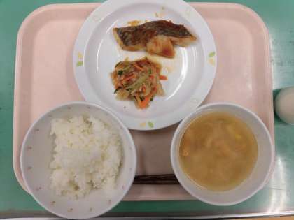シャキシャキとした歯ごたえがおいしい大根サラダができました。大根・にんじん・きゅうりとも、給食室で千切りにする手間をかけています。本日のみそ汁の具は地場産物、世田谷産のさといもです。