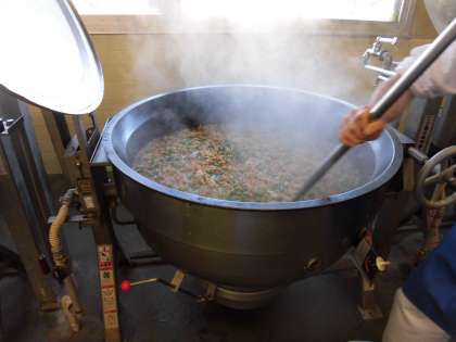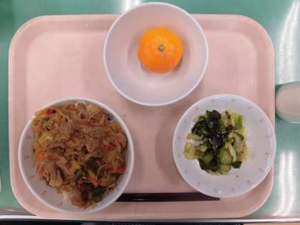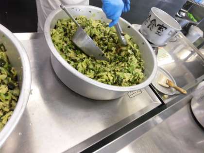 楽しみにしていた児童も多かった、人気献立のぶた丼の具ができあがりました。しらたき・ねぎなど具だくさんで、具材ののうま味がよく出ています。ごましょうゆ味のわかめサラダもできあがりです。