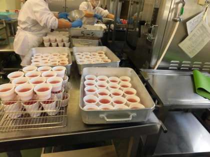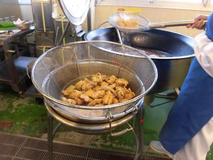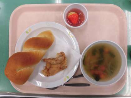 本日は少し早いクリスマス献立です。クリスマス定番のフライドチキンがカラッと揚がっています。デザートのゼリーは柔らかいクランベリーゼリーとやや硬めにしたオレンジクラッシュゼリーの2層にして、さらにいちごをのせました。クリスマスらしい楽しい給食になりました。
