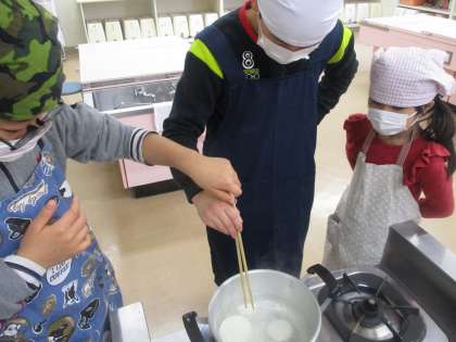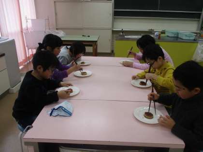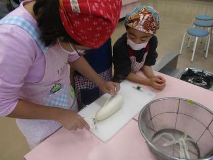 2・3時間目に調理学習をしました。先日の「自然の教室(大根抜き)」で、大根についての学習をしたので、大根を使った料理に挑戦してみました。メニューは「大根ステーキ」です。2つの班に分かれて、それぞれの役割を分担し、安全に気を付け、協力して作ることができました。ステーキソースで味を付けて、みんなで美味しくいただきました。