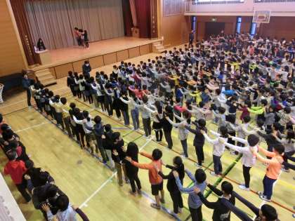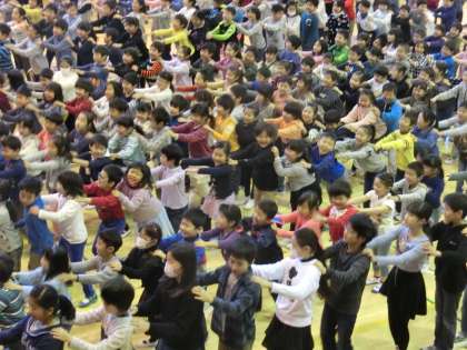 集会委員会が、舞台で手本を見せ、まずは、言うこといっしょやることいっしょから手始めにやってみました。各クラス男女合同で一列になり、チームワークよく取り組みました。どのクラスもほぼ成功でした。ところが、言うこと反対やること反対を経て、言うこといっしょやること反対になると、列が左右にふれながら大混乱。こんなはずじゃなかったと言わんばかりに顔を見合わせながら右に左にしっぽのようにはじけながら楽しく活動できたひとときでした。
