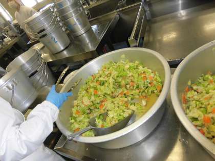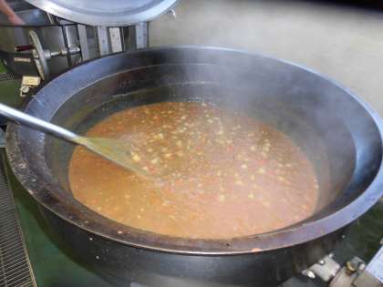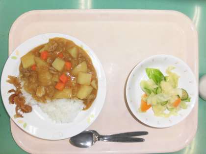 カレーライスは給食室でルーづくりを始めると校内中にカレーの良い香りがするため、早く食べたい気持ちが増すようです。こげないようにじっくり煮込んだチキンカレーができあがりました。