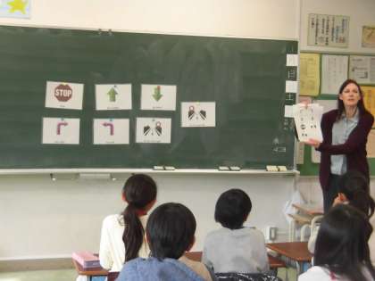 4年1組は2校時に、4年2組は3校時に英語活動がありました。本日は、「右」「左」「まっすぐ」「戻る」等、基本的な方角の学習をしました。レフトやライト、ストレートやバック等、日本でも普段の生活やスポーツによく使われる英語だったため、子どもたちは親しみを感じながら練習やゲームに取り組むことができました。