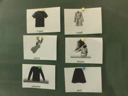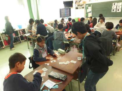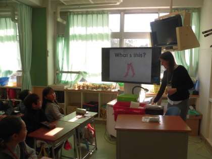 4年2組は4校時に英語活動がありました。本日は、身近な衣服の言い方について学習しました。セータやTシャツを英語で発音すると、日本語と発音がかなり違うところに難しさやおもしろさを感じていました。カードめくりゲームやペアゲームも、学習したことを生かして楽しんで取り組むことができました。