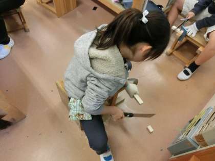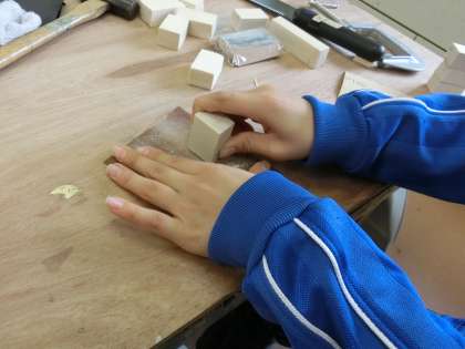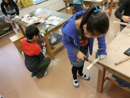 4年生は、ひさしぶりにのこぎりを使いました。Cクランプで角材をしっかりと固定し、いろいろな形に切っていきました。切った後は、部品を紙やすりで丁寧にこすっていました。
