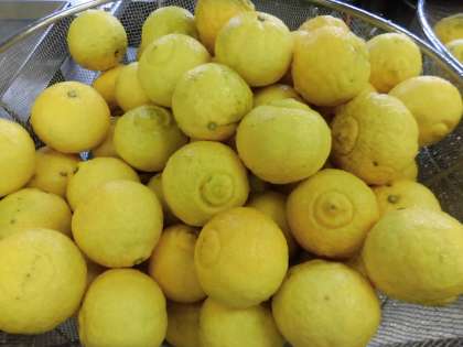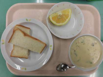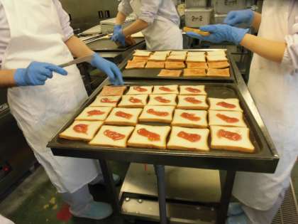 調理員さんたちが食パン1枚1枚丁寧にいちごジャムをぬりジャムサンドを作っています。ジャムを測る担当・塗る担当・切る担当・パン缶に入れる担当と決まっています。本日の果物は「はるか」酸味が強そうな黄色い皮ですが、果肉はプリプリとした食感でとても甘い果物です。