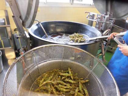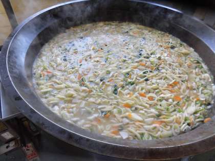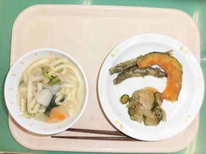 本日の天ぷらはかぼちゃとししゃもです。ししゃもの天ぷらには青のりが入っているので、磯の香りがししゃもをさらに食べやすくしています。みそ味で煮込んだ具だくさんなうどんができあがりました。温かいうどんをしっかり食べて体の芯から暖まりました。