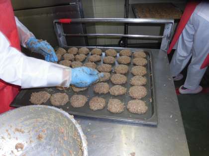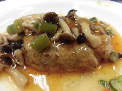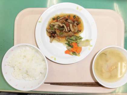 毎月19日は食育の日、本日の献立は東京都八丈島産のむろあじをつかったむろあじバーグです。新鮮なむろあじミンチをよく練り1個ずつハンバーグをつくりました。オーブンでしっかり焼き、きのこあんをかけてできあがりです。