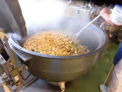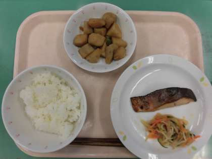 本日の魚は旬の魚ぶりです。ぶりを照り焼き用のたれに漬け、オーブンでしっかり焼きました。本日のさといもは世田谷産の予定でしたが天候不良のため栃木県産に変更です。さといもは軽くゆでてから甘辛煮にしたので煮くずれをせずできあがりました。