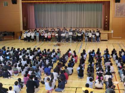 本日の音楽集会では、「あおぞらのマーチ」という曲を4年生が全校児童の前で歌いました。4年生の元気よい歌声が体育館に響き渡り、低学年の児童は体でリズムをとったり、曲を口ずさんだりと、楽しんで曲を聞いていました。曲をつくってくださった方に指揮を、さくらころんのみなさまにサポートしていただきながら4年生は練習の成果を発揮することができました。ご協力していただき、どうもありがとうございました。