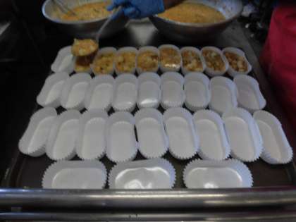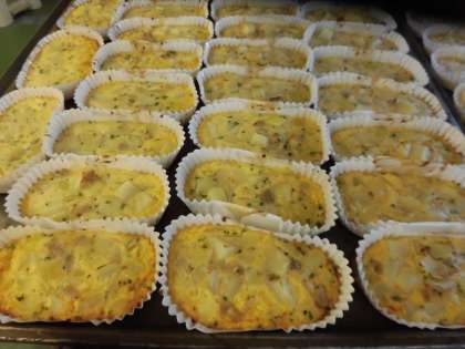 スペイン風オムレツはオープンオムレツと似ていますが、半熟たまごではなくしっかり加熱するところが大きな違いです。低・中・高とオムレツの分量を変えてカップに入れてオーブンでしっかり焼き、具だくさんなオムレツができました。