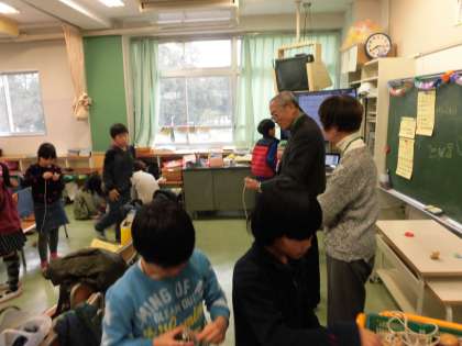 本日、生活科「おばあちゃん、おじいちゃんから昔遊びを教えてもらおう」として、4校時から、児童のお祖父様、お祖母様に来て頂きました。