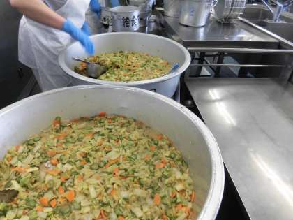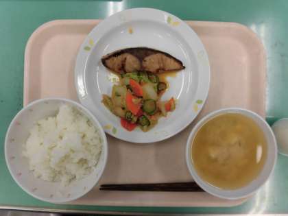 本日は旬のぶりを照り焼きにしました。ぶりは出世魚といわれる魚で成長するごとに名前が違うことをミニ給食便りで伝えました。白菜の甘みがおいしい和風サラダもできあがりました。