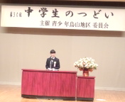 青少年烏山地区委員会主催による「第30回中学生のつどい」が烏山区民センターで開かれました。烏山地区の3校(烏山中、芦花中、上祖師谷中)の中学生が、自分の主張を堂々と延べました。また、3校の音楽の発表がありました。中学生の素晴らしさを感じた催しでした。