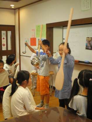 また、給食の調理道具の大きさを普通の道具と並べて見せてくれました。
