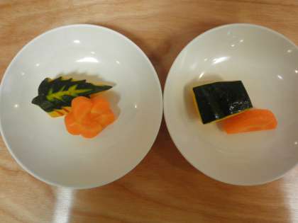 調理員の松田さんが、飾り切りを実際にかぼちゃで飾り切りを見せてもらいました。また、実際にサツマイモで作った鶴や米俵を見せてもらいました。
