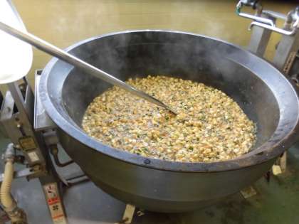 麻婆豆腐にはたくさんの野菜や大豆のみじん切りが多く入っています。あんの濃厚な味付けもあり、野菜の食感や味がわかりにくいため、しっかり野菜が食べられる献立になっています。加熱した豆腐と最後に混ぜてできあがりです。